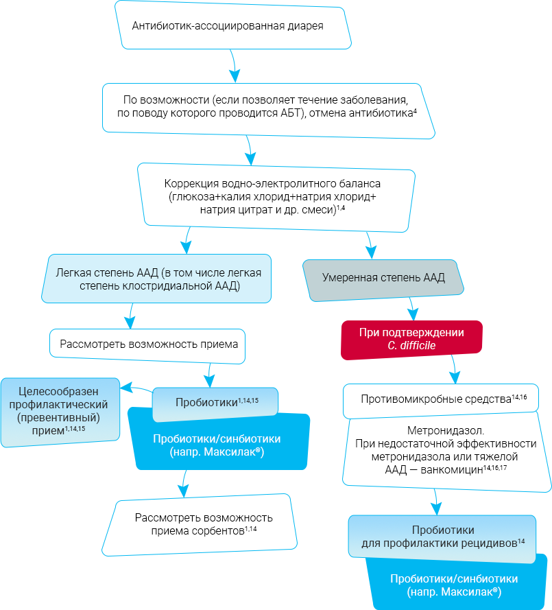 Картина AAД варьирует от идиопатического энтерита, который связывают с активацией группы условно-патогенных микроорганизмов на фоне подавления прежде всего метаболической активности нормальной микрофлоры тонкой кишки, до патоген-специфической ААД (антибиотик-ассоциированный колит), связанной с C. difficile, Clostridium perfringens, Klebsiella oxytoca.5