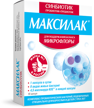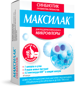 Синбиотик Максилак® содержит в 1 капсуле 9 пробиотических штаммов в количестве 4,5×109 КОЕ