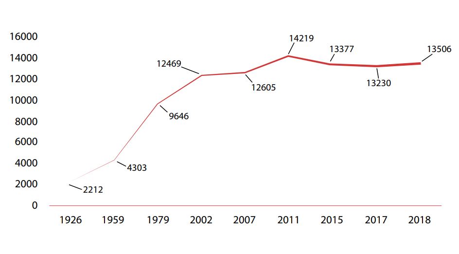 Рис. 1. Динамика численности населения России в возрасте старше 70 лет (тысяч человек) [1].